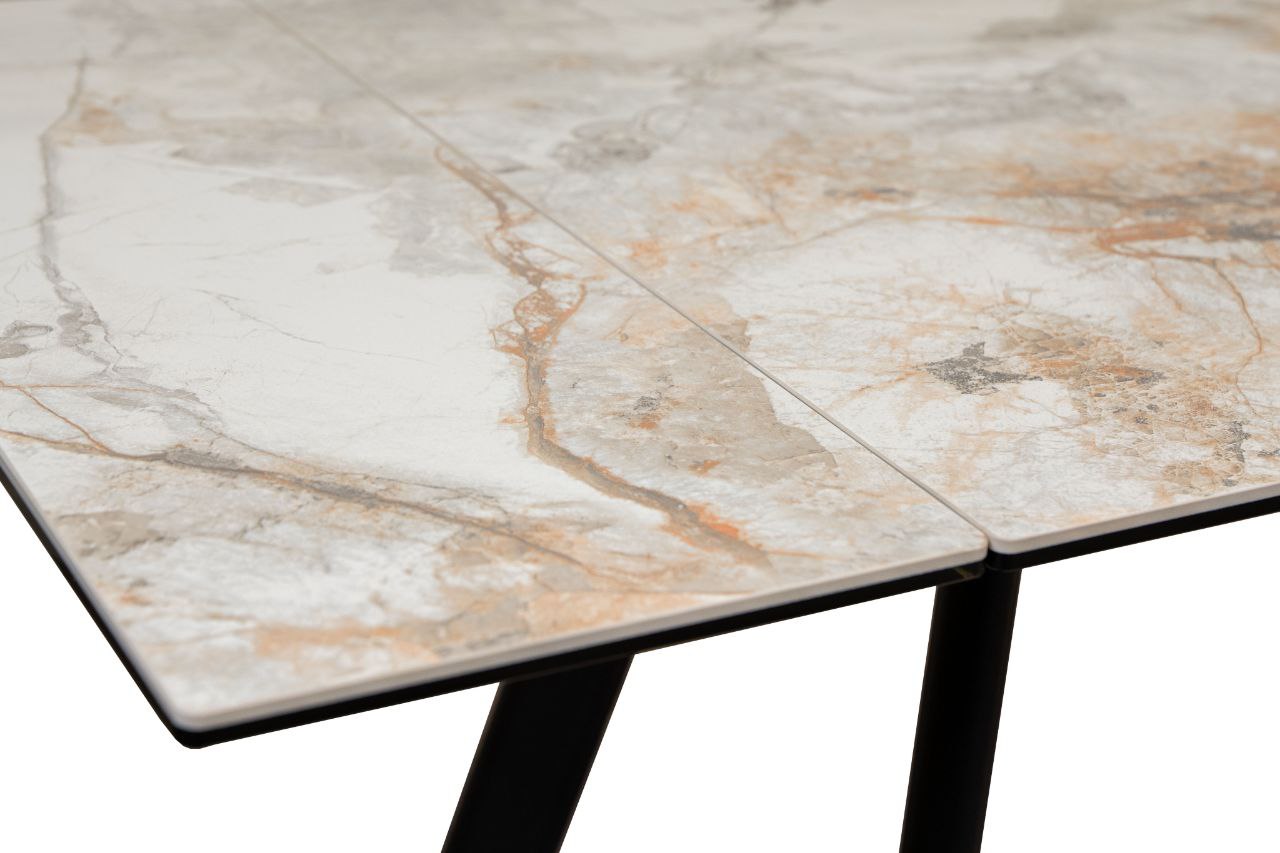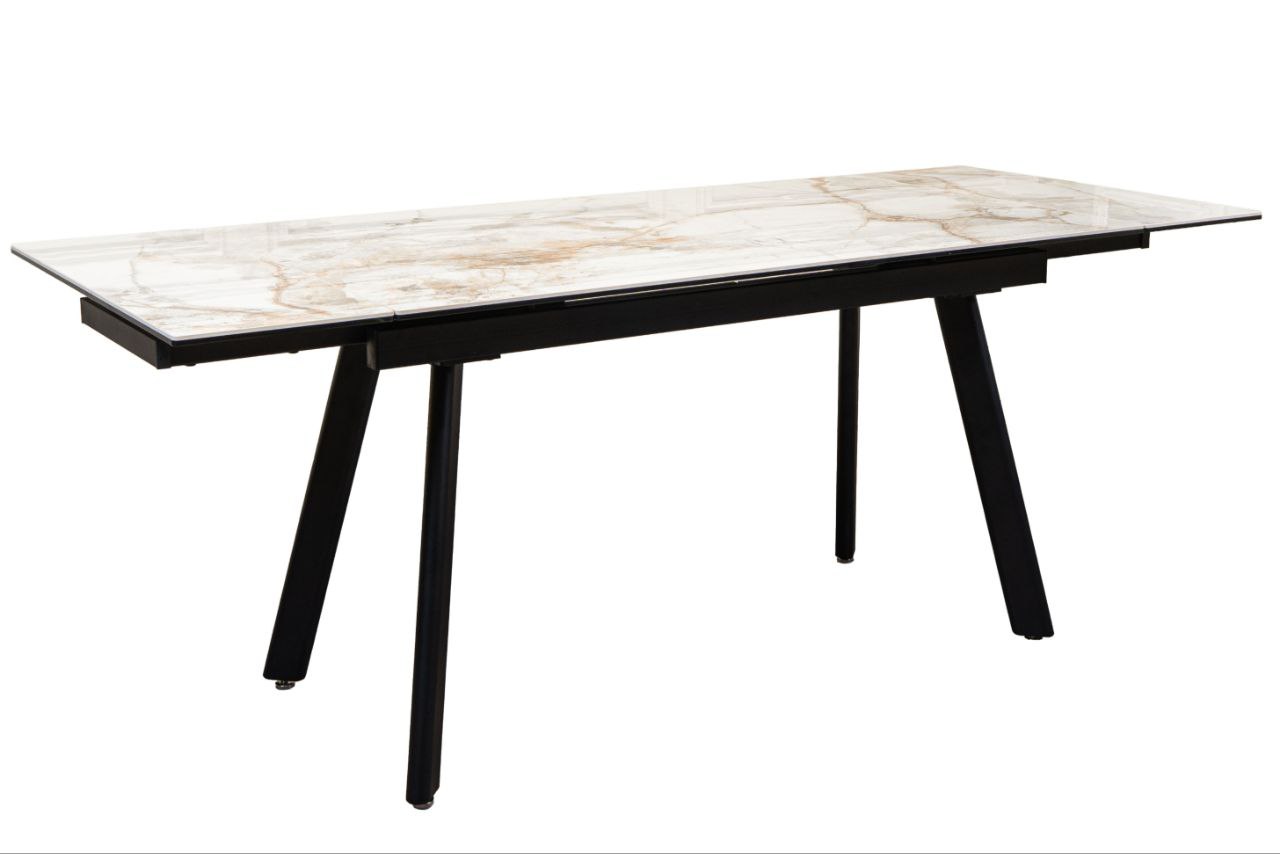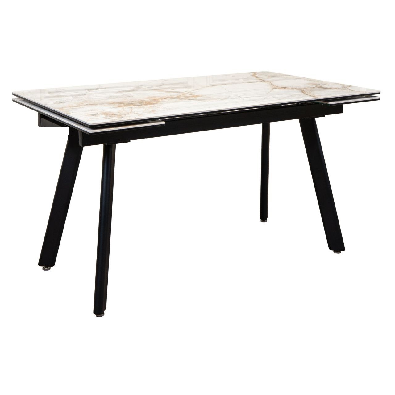 Обеденный стол Sigma 140 см с двумя выдвижными вставками (+30 см × 2), глянцевая керамическая столешница в цвете белый мрамор.