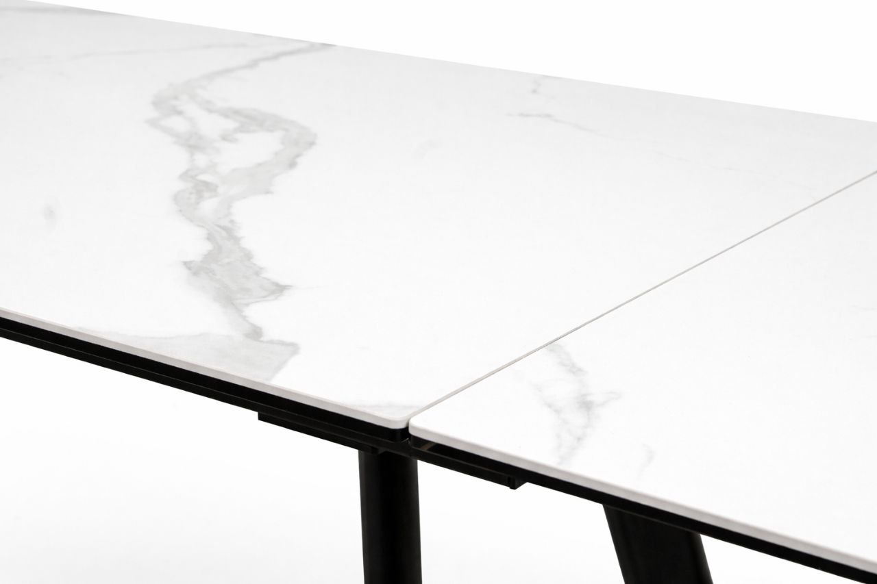 Обеденный стол Sigma 140 см с двумя выдвижными вставками (+30 см × 2), матовая керамическая столешница в цвете белый мрамор.