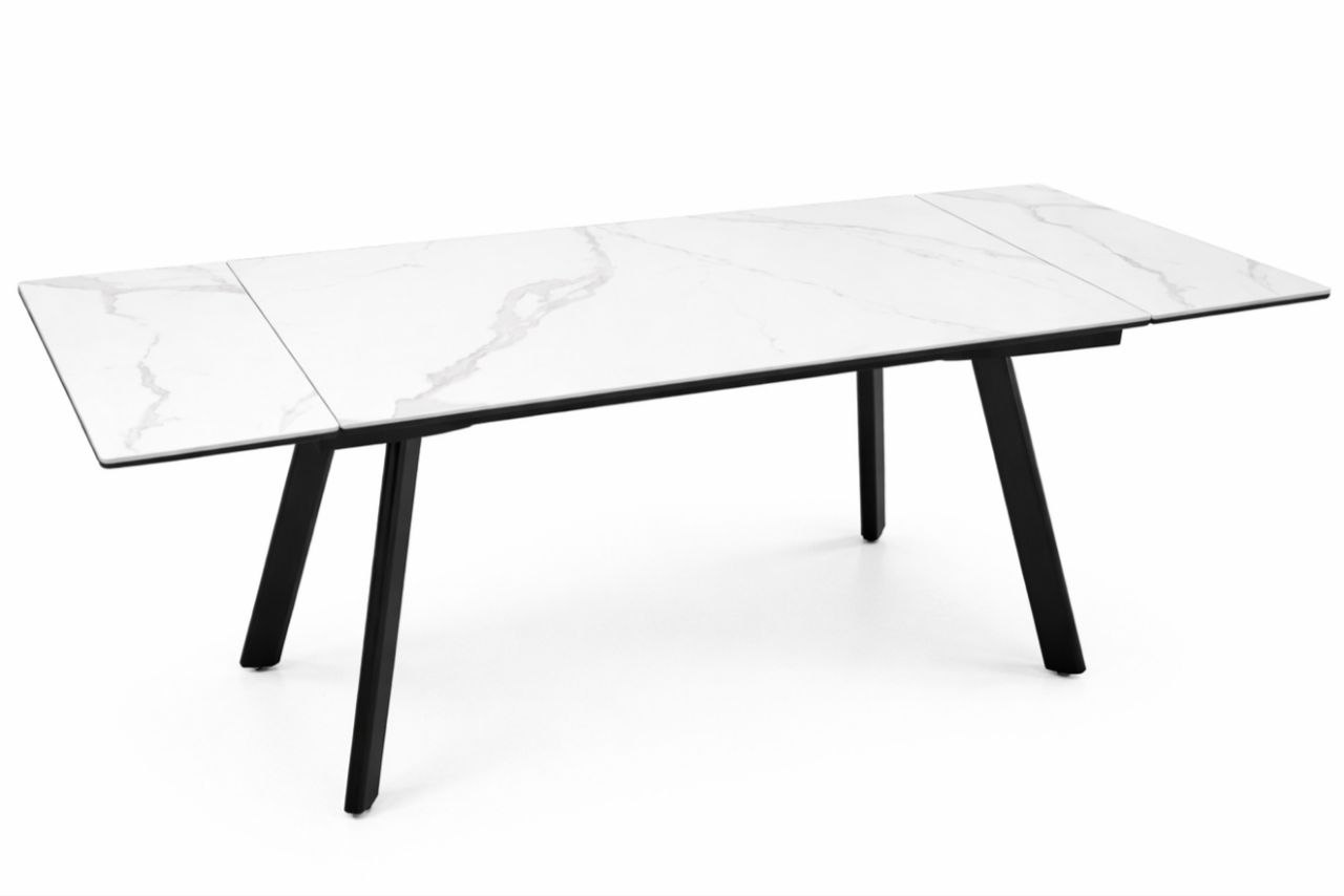 Обеденный стол Sigma 160 см с двумя выдвижными вставками (+40 см × 2), матовая керамическая столешница в цвете белый мрамор.